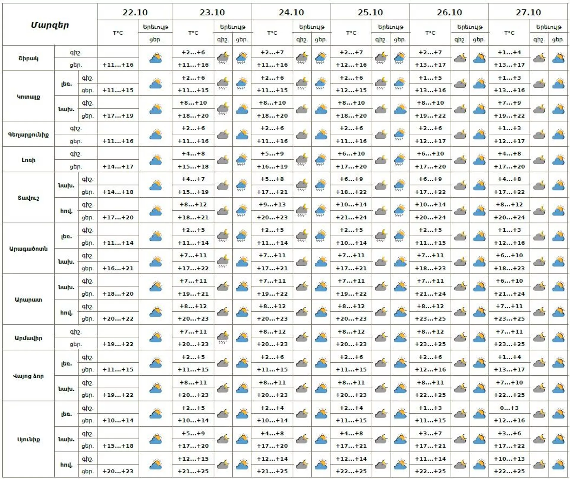 Հայաստանի Հանրապետության առանձին շրջաններում հոկտեմբերի 23-25-ին սպասվում է կարճատև անձրև։ Տեղեկությունը հայտնում է ՀՀ ՇՄՆ Հիդրոօդերևութաբանության և մոնիտորինգի կենտրոնը։