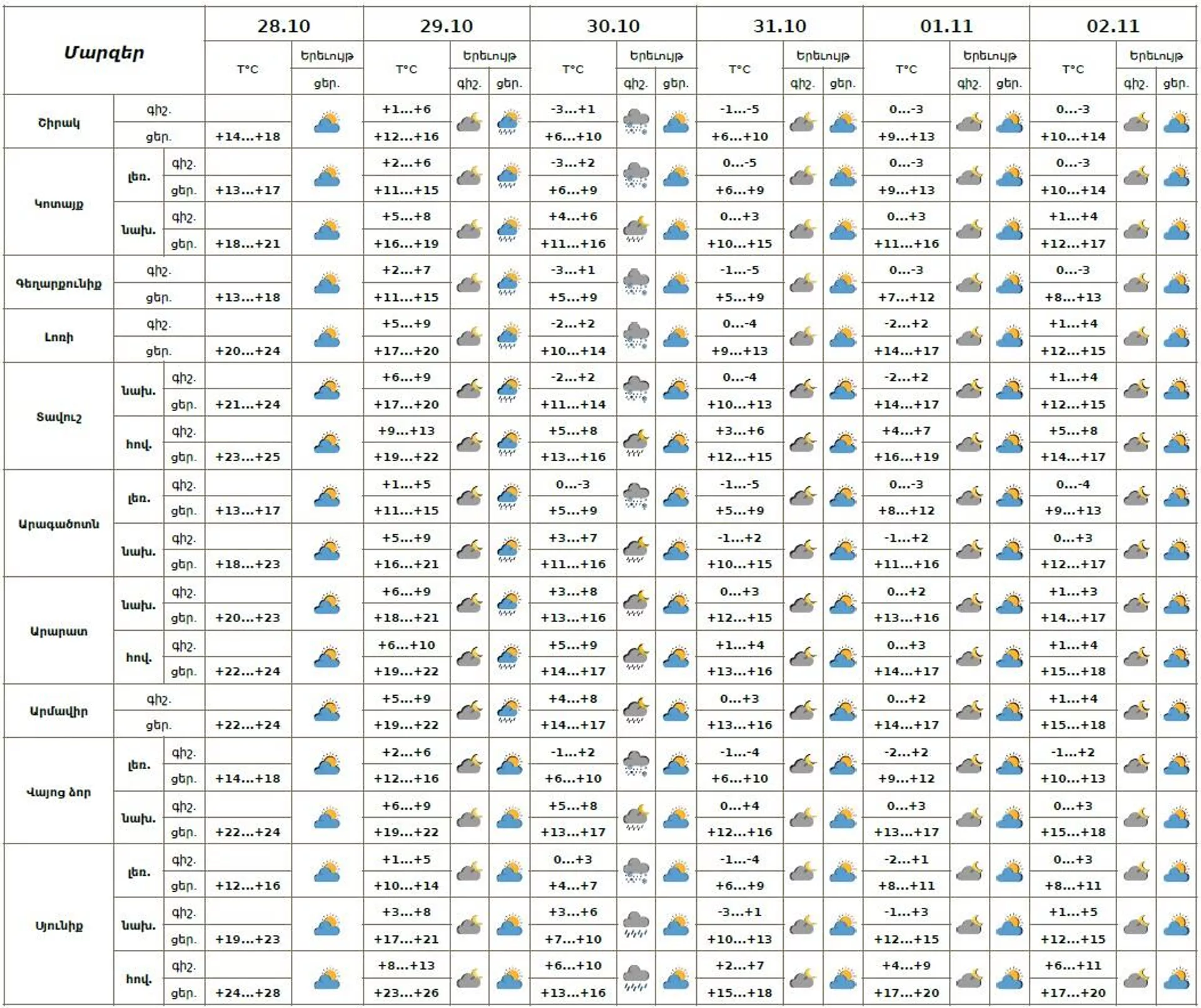 Օդի ջերմաստիճանը հոկտեմբերի 29-30-ին կնվազի 6-9 աստիճանով, նոյեմբերի 1-2-ին աստիճանաբար կբարձրանա 3-5 աստիճանով։