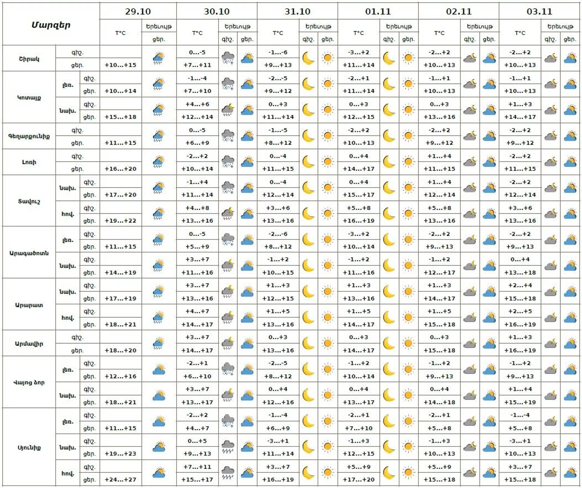 Օդի ջերմաստիճանը հոկտեմբերի 30-ին կշարունակի նվազել, նոյեմբերի 1-3-ին աստիճանաբար կբարձրանա 2-4 աստիճանով։