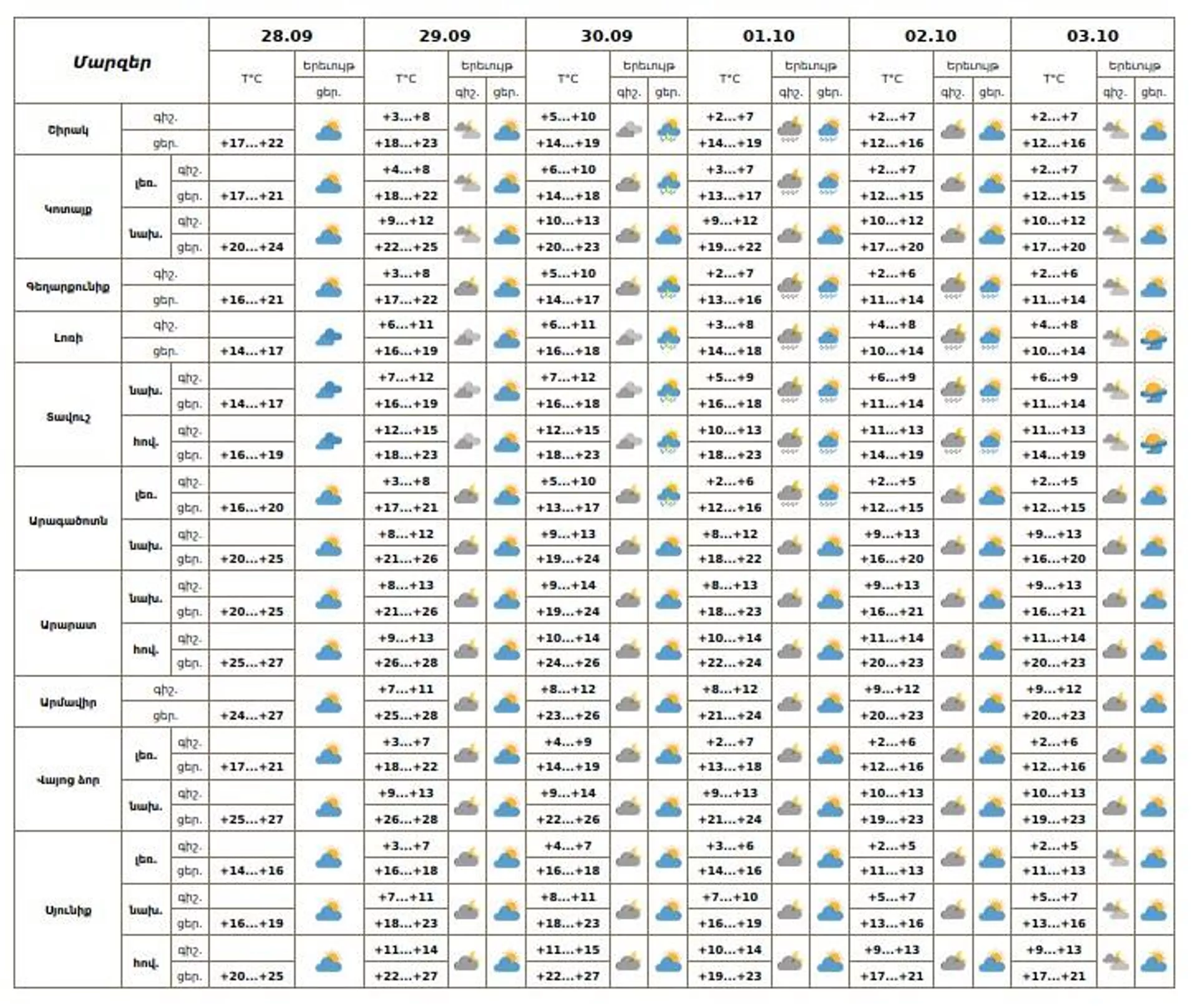 Սեպտեմբերի 29-30-ին առանձին շրջաններում սպասվում է քամու ուժգնացում ՝ 16-19 մ/վ արագությամբ։ Օդի ջերմաստիճանը աստիճանաբար կբարձրանա 3-5 աստիճանով։