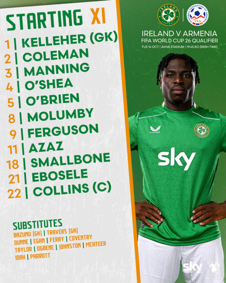 ԱԱ-2026-ի եվրոպական գոտու որակավորման փուլի F խմբի 4-րդ տուրում Հայաստանի ազգային հավաքականը Դուբլինի «Ավիվա» մարզադաշտում կհյուրընկալվի Իռլանդիայի հավաքականին։ Այս մասին գրում է ArmSport.am-ը։