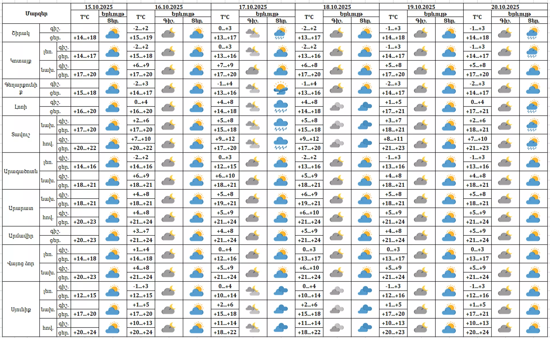 Հայաստանի Հանրապետության տարածքում հոկտեմբերի 16-ին, 17-ի գիշերը, 18-19-ին , 20-ի գիշերը սպասվում է առանց տեղումների եղանակ։ Հոկտեմբերի 17-ի և 20-ի ցերեկն առանձին շրջաններում սպասվում է կարճատև անձրև։