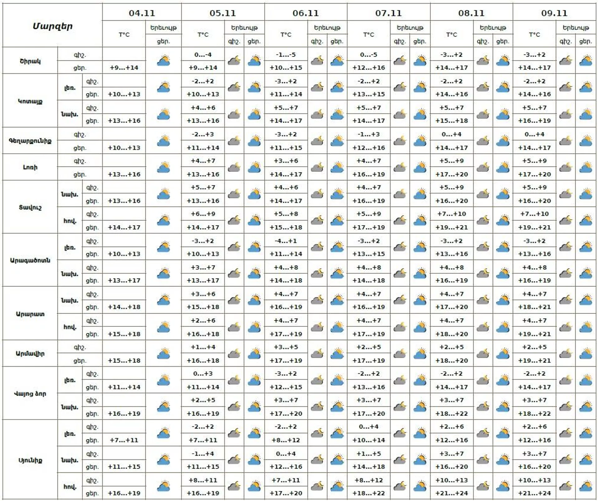 Տեղեկացվում է, որ օդի ջերմաստիճանը նոյեմբերի 6-9-ին աստիճանաբար կբարձրանա 3-5 աստիճանով։