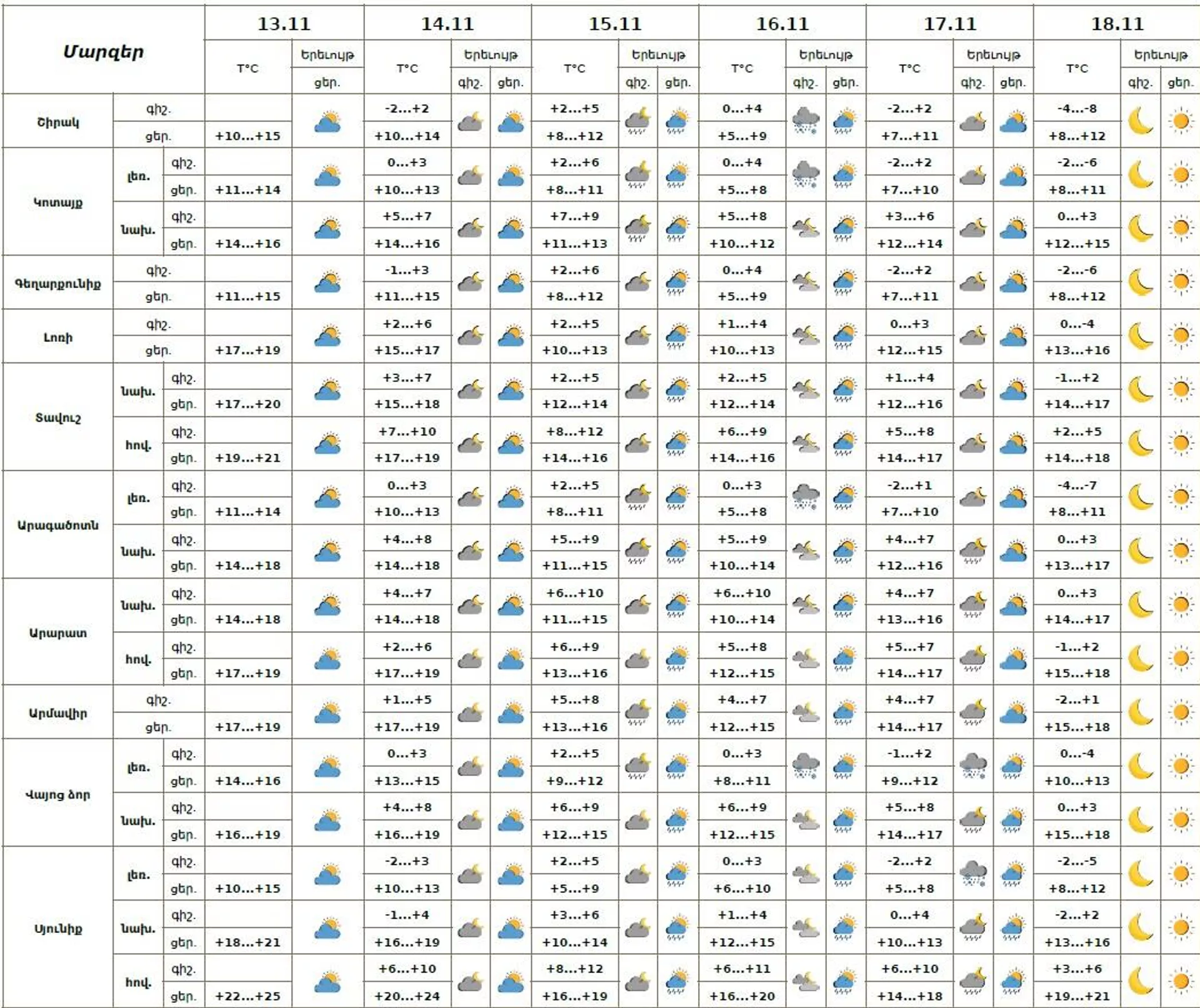 Հայաստանի Հանրապետության տարածքում նոյեմբերի 14-ին, 18-ին սպասվում է առանց տեղումների եղանակ: Նոյեմբերի 15-17-ին առանձին շրջաններում սպասվում են կարճատև տեղումներ, գիշերը լեռնային գոտիներում ձնախառն անձրևի տեսքով։ Տեղեկությունը հայտնում է Հիդրոօդերևութաբանության և մոնիտորինգի կենտրոնը։